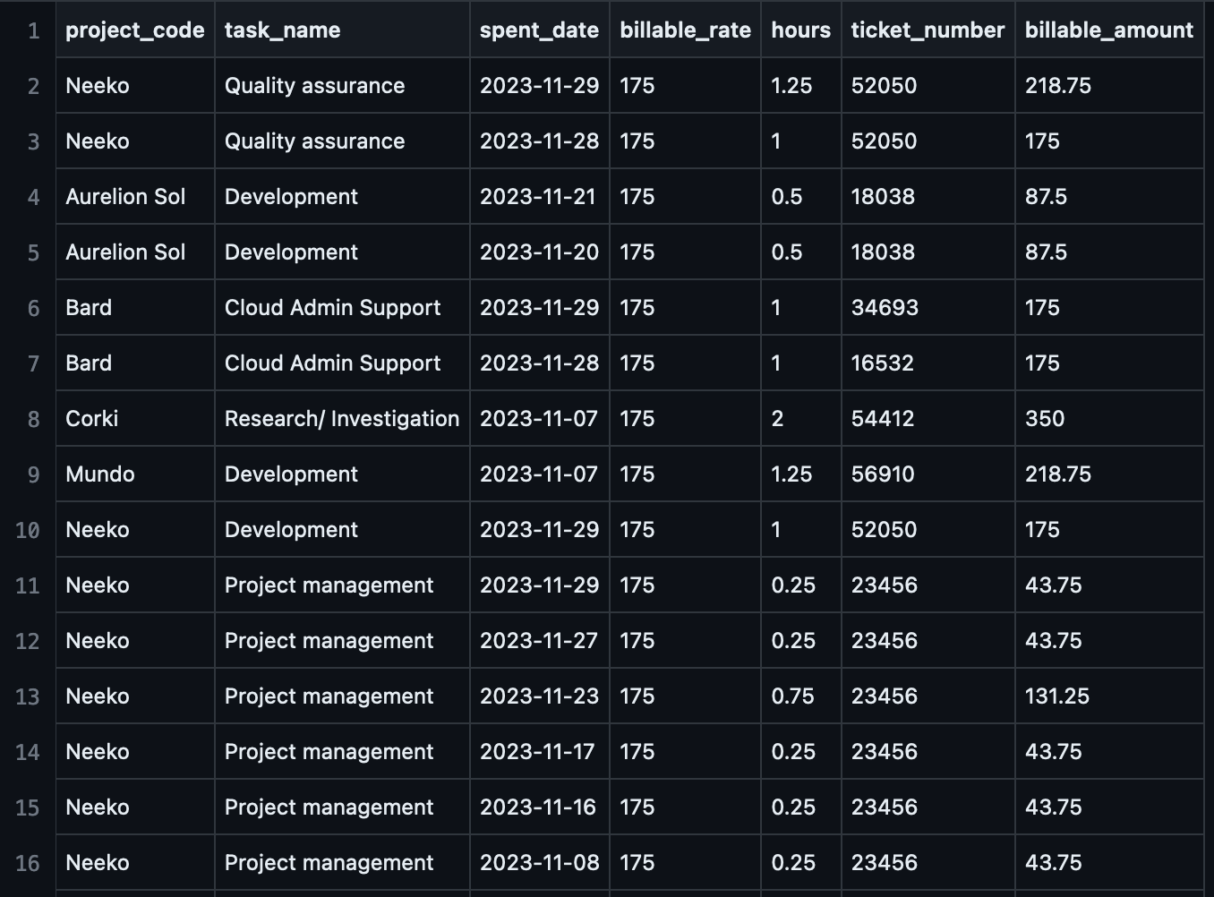The screenshot below is a snapshot of the data input. In this data sample there are seven columns and 232 rows. Each row is one time entry that records the hours and billable amount for a particular task done for a particular ticket that belongs to a particular project during a period of time. For instance, the first entry records 1.25 hours spent on doing quality assurance testing for ticket 52050 of project Neeko on 2023-11-29, and this entry can be billed for $218.75. One ticket can have several entries (rows).